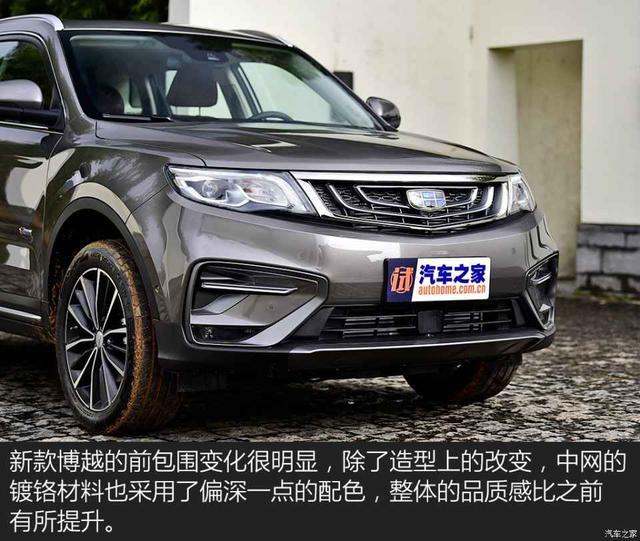 1、外观设计:吉利博越最新款的外观设计时尚大气,前脸采用了家族式的设计语言,大尺寸的进气格栅和犀利的大灯组合,给人一种强烈的视觉冲击。